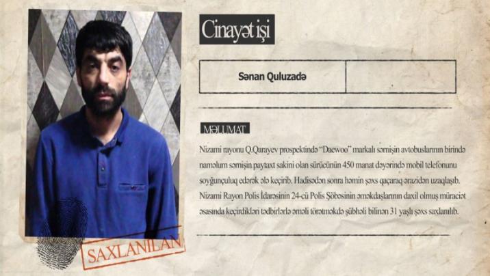 Nizami Rayon Polis İdarəsinin 24-cü Polis Şöbəsinin əməkdaşlarının daxil olmuş müraciət əsasında keçirdikləri tədbirlərlə əməli törətməkdə şübhəli bilinən 31 yaşlı Sənan Quluzadə saxlanılıb. Həmin şəxsin törətdiyi hadisə təhlükəsizlik kameraları vasitəsilə də anbaan lentə alınıb.