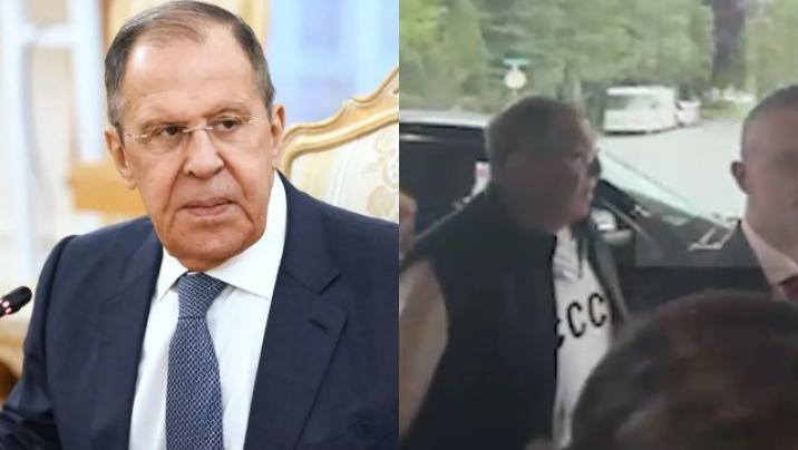 Videoda Rusiyanın xarici işlər nazirinin ağ sviter və jilet geyinərək avtomobildən çıxması əks olunub.