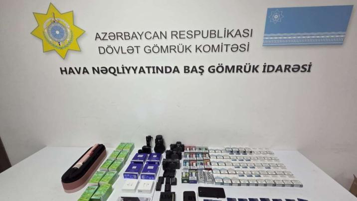 Şarja-Bakı aviareyisi ilə gələn Azərbaycan Respublikası vətəndaşının çantalarına gömrük baxışı həyata keçirilib və gömrük orqanına bəyan edilməyən 2 ədəd mobil telefon, 3 ədəd fotoaparat, 10800 ədəd xarici markalı siqaret, 16 ədəd elektron siqaret, 10 ədəd qida əlavəsi, "Dyson" markalı saç feni və digər mallar aşkarlanıb.