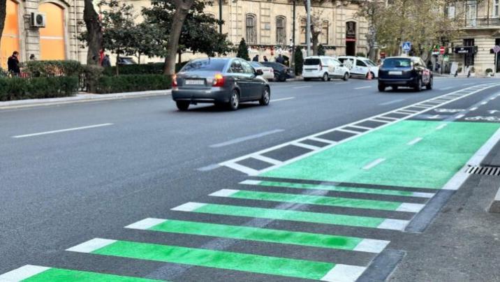 Bakıda velosiped yolları layihəsi çərçivəsində yol kəsişmələrində təhlükəsizlik tədbirlərinin artırılması məqsədilə yaşıl boya çəkilir.