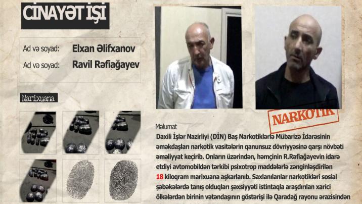 Daxili İşlər Nazirliyindən Stopnarkotik.az-a verilən xəbərə görə, tədbir zamanı əvvəllər məhkum olunmuş Elxan Əlifxanov və tanışı Ravil Rəfiağayev saxlanılıblar. Onların üzərindən, həmçinin R.Rəfiağayevin idarə etdiyi avtomobildən tərkibi psixotrop maddələrlə zənginləşdirilən 18 kiloqram marixuana və narkotiklərin dövriyyəsində istifadə olunan bank kartı aşkarlanıb.