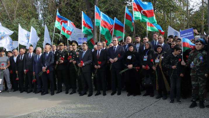Daha sonra yürüş iştirakçıları terror zamanı şəhid olan mülki vətəndaşların adlarının əks olunduğu lövhənin önünə tər çiçəklər düzüblər.