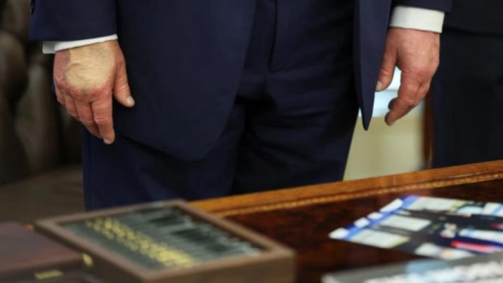 ABŞ Prezidenti Donald Trampın sağ əlində yenidən qalın təbəqə örtücü (tonal) krem ilə gizlədilmiş qançır müşahidə edilib.