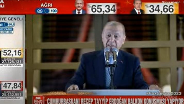 Qeyd olunub ki, seçki qutularının 42.78%-i açılıb. ilkin nəticələrə əsasən, “Cümhur İttifaqı”nın namizədi Rəcəb Tayyib Ərdoğan seçicilərin 57, 09% (11.499.994), “Millət İttifaqı”nın namizədi Kamal Kılıçdaroğlu isə 42,91%-nin (8.642.542 ) səsini qazanıb.