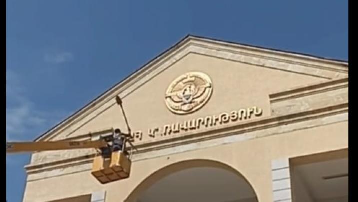 Xankəndi şəhərində separatçıların özləri üçün uydurduqları "atributlar" sökülür.