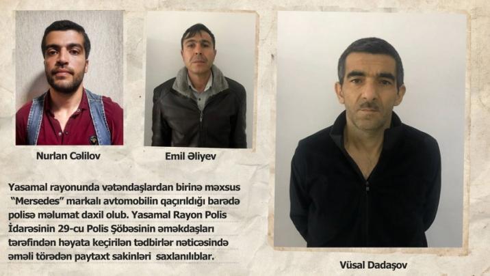 Bildirilib ki, Yasamal Polis Şöbəsinin əməkdaşları tərəfindən həyata keçirilən tədbirlər nəticəsində əməli törədən paytaxt sakinləri Nurlan Cəlilov, Vüsal Dadaşov və Emil Əliyev saxlanılıblar. Onların oğurladıqları avtomobili satmaq istədikləri müəyyən olunub.